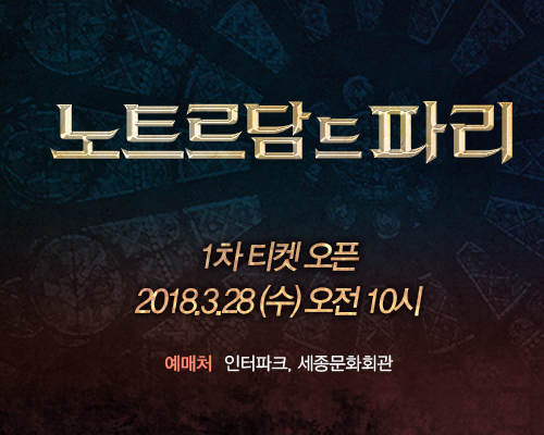 [한국어버전 10주년] 1차 티켓오픈 안내 20년간 전세계적으로 사랑 받아온 명작!뮤지컬 노트르담 드 파리 한국어버전 10주년일시 : 2018년 3월 29일 수요일 오전 10시예매처 : 인터파크, 세종문화회관 글목록